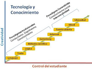 - La Educación de la Sociedad del Conocimiento fluido (NO depositado) se distingue por la movilidad, interactividad y ubicuidad, ofrece un continuum de aprendizaje en el espacio y en el tiempo y también un continuum dentro y fuera del aula. La difusión en la red de contenidos educativos, de herramientas y la interacción de los agentes educativos en ella, provoca prácticas sociales que modifican la cultura y la misión de la educación mediatizada. Los dispositivos portátiles, los documentos digitales, los estudiantes nómades se inscriben en una estrategia de aprendizaje en red y una ergonomía adaptada a la diversidad de situaciones (Graciela Rabajoli). Hasta ahora conocíamos la interactividad entre el aprendiz y la máquina y la interactividad (comunicación y colaboración) entre profesores, colegas y expertos. La computación ubicua conlleva una nueva forma de comunicación con las máquinas y entre máquinas sin intervención humana (Sonia E. Rodríguez).